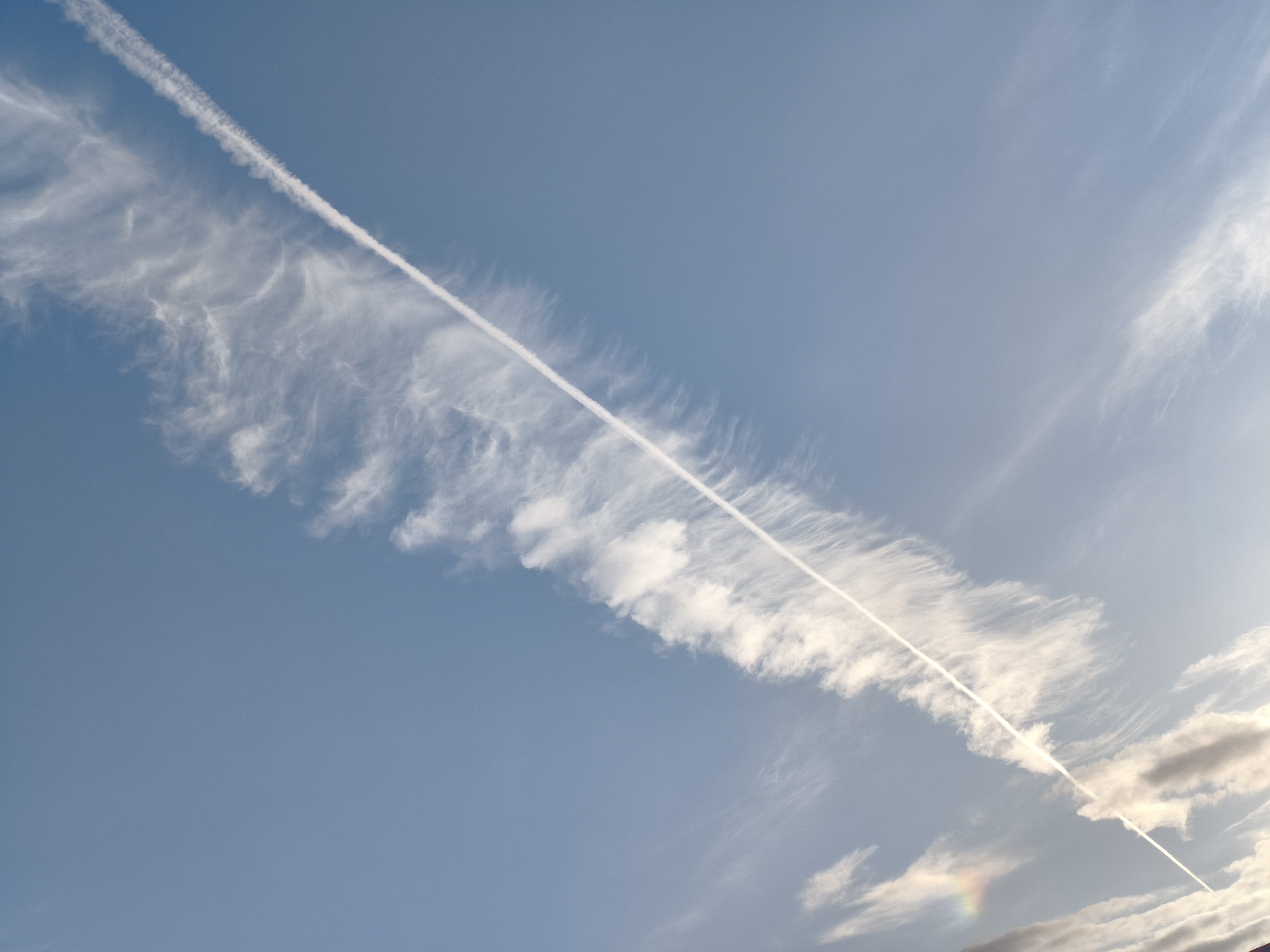 外は幻想的な空模様。広角カメラにも収まらない長ーい飛行機雲と、部分的な虹も見えます。