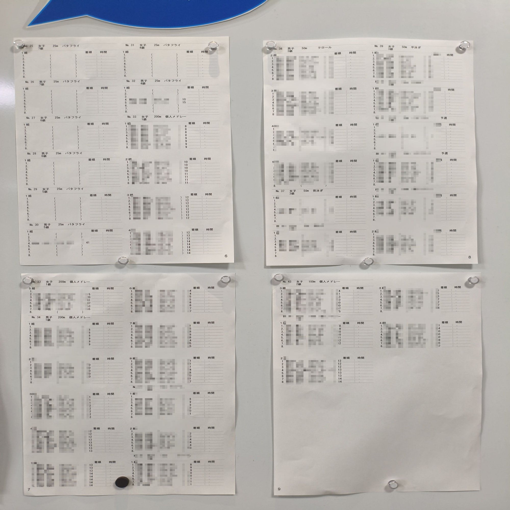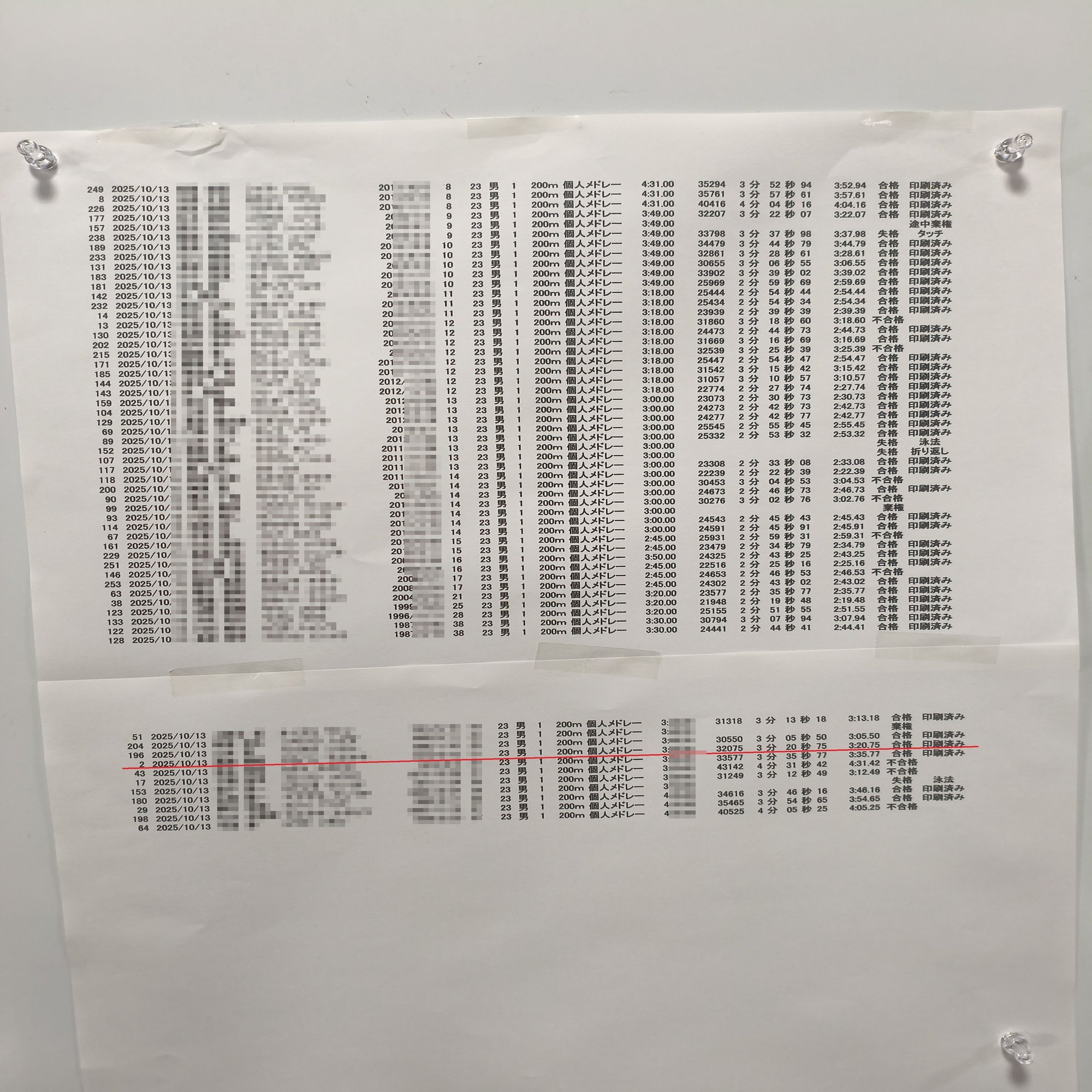 私は一番右端の1レーン。序盤のバタフライ50mで、同年齢の選手が私より3mぐらい先行しているのが見えてしまい、「ああ、もうだめだ」と気持ちが折れてしまいましたが、2種目目の背泳ぎ時に彼を抜いていたようです。ゴールタイムは彼より15秒も速く、自分でもびっくりでした。普段通っているフィットネスのプールでの自己ベストたしか3分33秒を13秒も更新。私はもうウン十代ですが、それよりも厳し目の30代の1級合格タイム3分30秒を余裕でクリアし、あと0.75秒速ければ更に厳しい20代の合格タイム3分20秒を切れそうでした。同一組では2位ゴールでした。